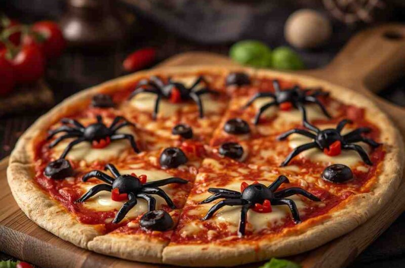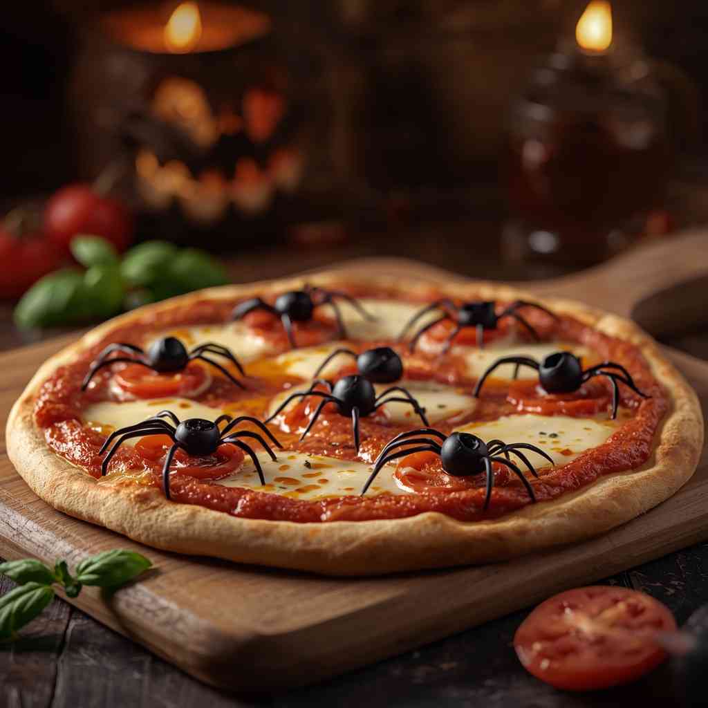 - Step 4: Create the Olive Spiders : Slice black olives in half — these will be the spider bodies. Cut the remaining halves into thin strips to form eight legs per spider. Arrange each olive “body” on the pizza, then carefully position the thin slices around it like spider legs. Pro tip: Use a small knife or tweezers for precise placement.