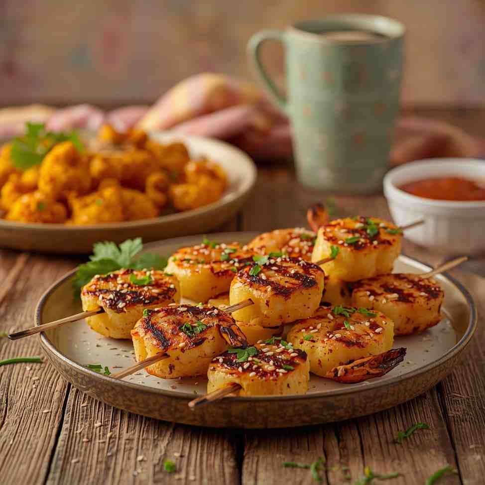 This vibrant dish brings together two irresistible flavors — the tropical sweetness of grilled pineapple and shrimp skewers and the crispy, tangy-spicy delight of sweet chili cauliflower bites. The shrimp skewers are juicy, caramelized, and infused with a zesty marinade, while the cauliflower bites are light yet crunchy, coated in a glossy, sticky sweet chili glaze.