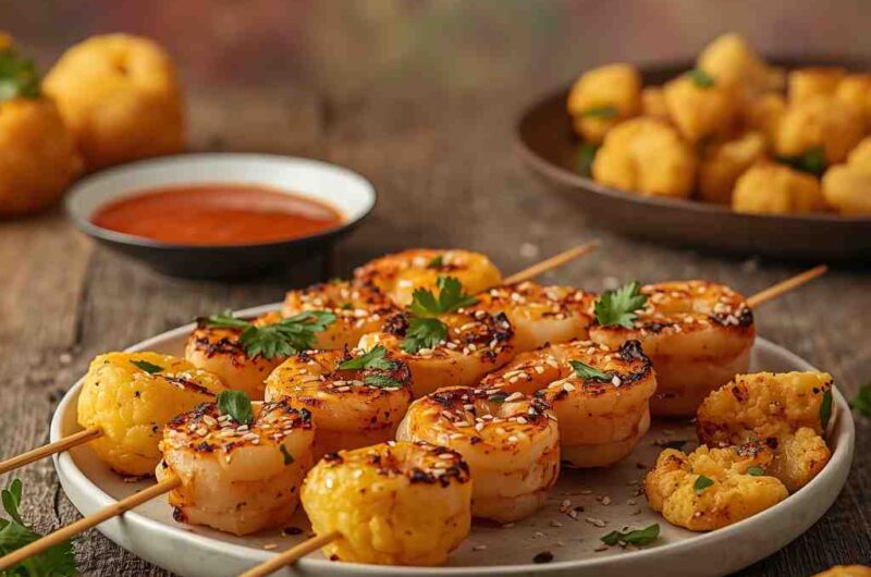 Grilled Pineapple and Shrimp Skewers with Sweet Chili Cauliflower Bites is a vibrant, flavor-packed meal that perfectly balances sweet, smoky, spicy, and tangy elements. It’s a feast for the eyes and taste buds — combining tropical seafood delight with a crisp vegetarian favorite.