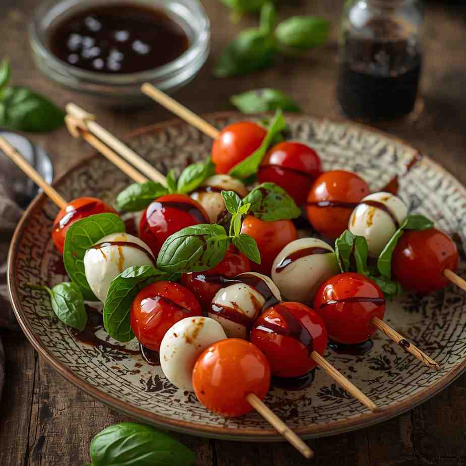- Step 4: Season and Dress ; Arrange the skewers neatly on a serving platter. Drizzle lightly with olive oil. Add a generous drizzle of balsamic glaze over the top. Sprinkle with salt and freshly ground black pepper.