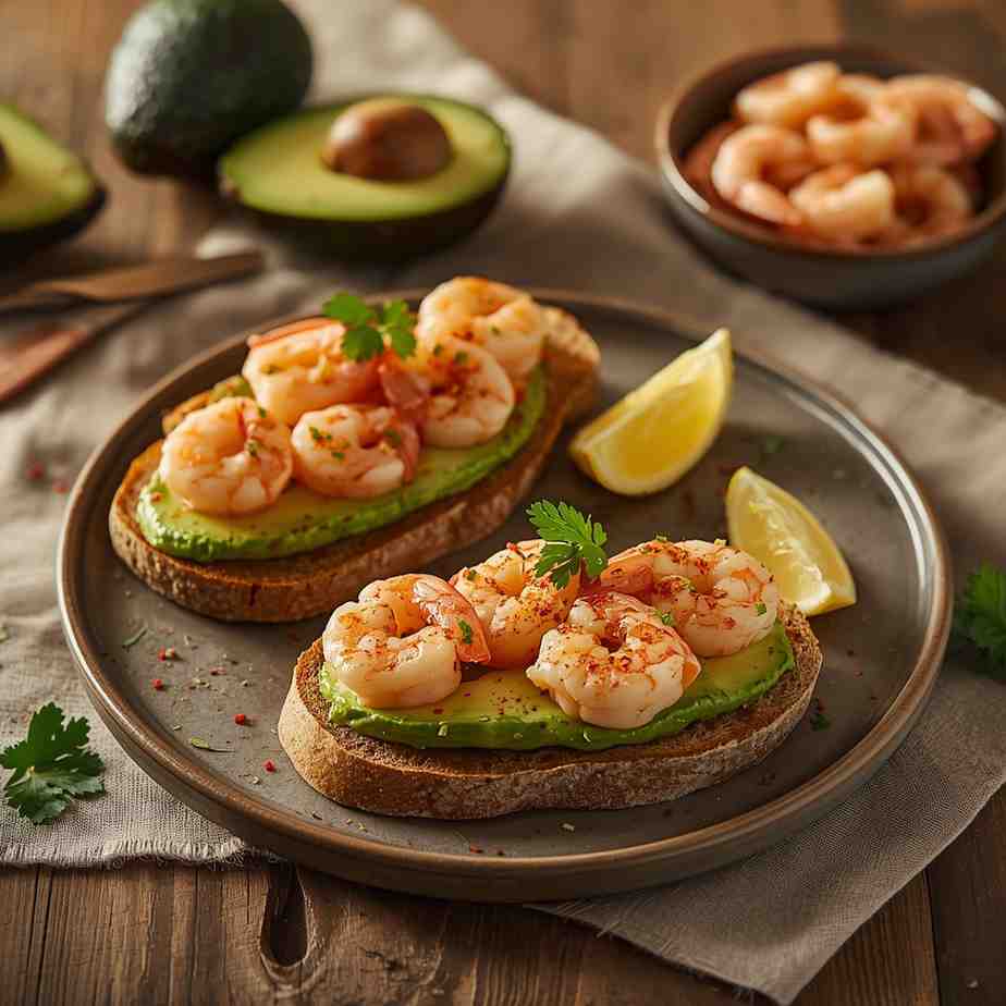 - Step 4: Assemble the Toasts : Spread a generous layer of avocado mixture on each toasted bread slice. Arrange shrimp on top (3–4 per toast, depending on size). Sprinkle with chili flakes, microgreens, or lemon zest for extra flavor and presentation.