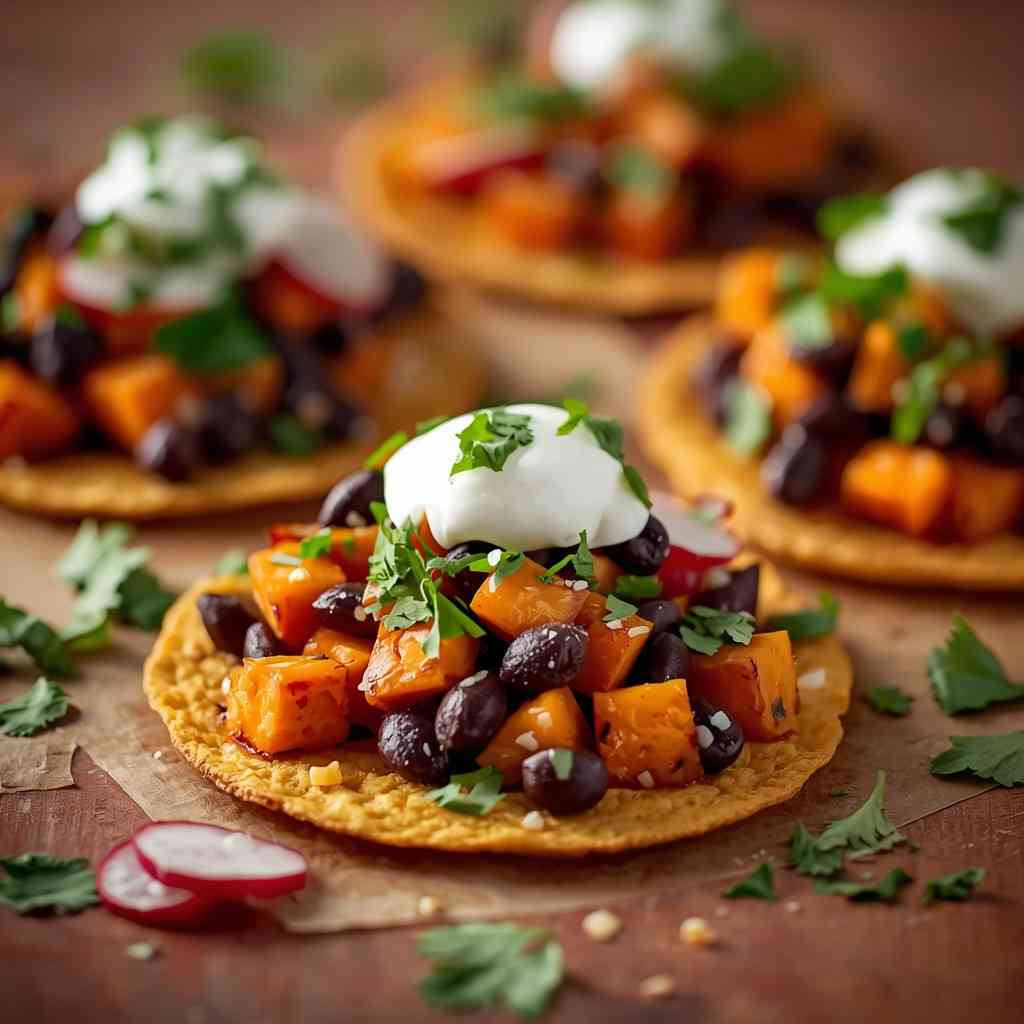 - Assemble tostadas: Spread a layer of roasted sweet potatoes on each tostada, then top with black beans.