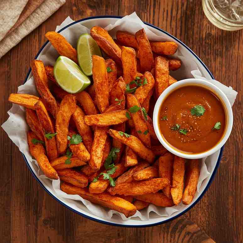 • Step 5: Serve : Place baked sweet potato fries on a serving platter. Serve with chipotle dip on the side. Optionally, garnish with fresh cilantro or lime wedges