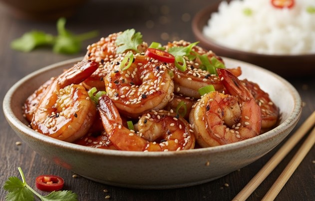 • Step 3: Garnish and Serve : Sprinkle sesame seeds and green onions over shrimp. Serve immediately with rice, noodles, or steamed veggies.