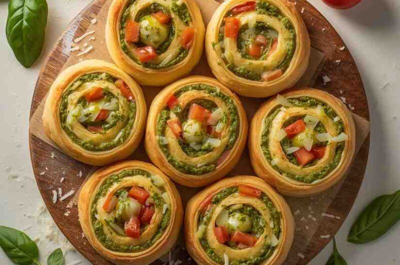 Tomato Basil Pesto Pinwheels are a delightful fusion of Italian-inspired flavors rolled into flaky puff pastry perfection. These golden, crispy bites feature a savory mix of rich basil pesto, juicy tomatoes, and melted cheese — all spiraled together to create the ultimate party snack or appetizer.