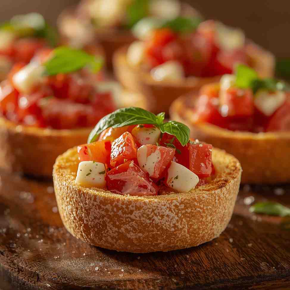 Unlike traditional bruschetta served on slices of bread, these are served in crisp pastry or phyllo cups, making them easy to handle at parties or gatherings