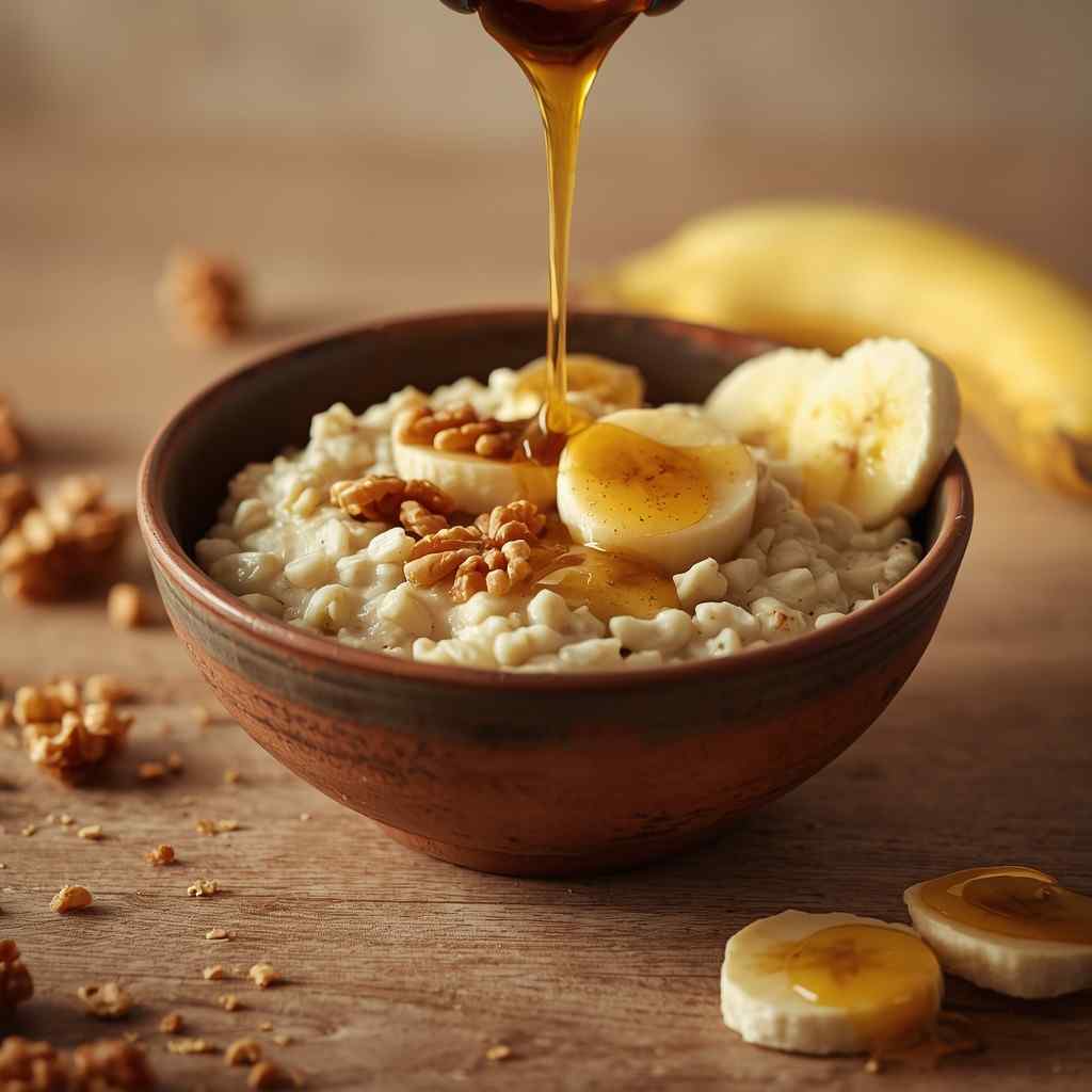 - Step 5: Serve & Garnish : Transfer oatmeal to serving bowls. Top with chopped walnuts, extra banana slices, and an extra drizzle of honey.