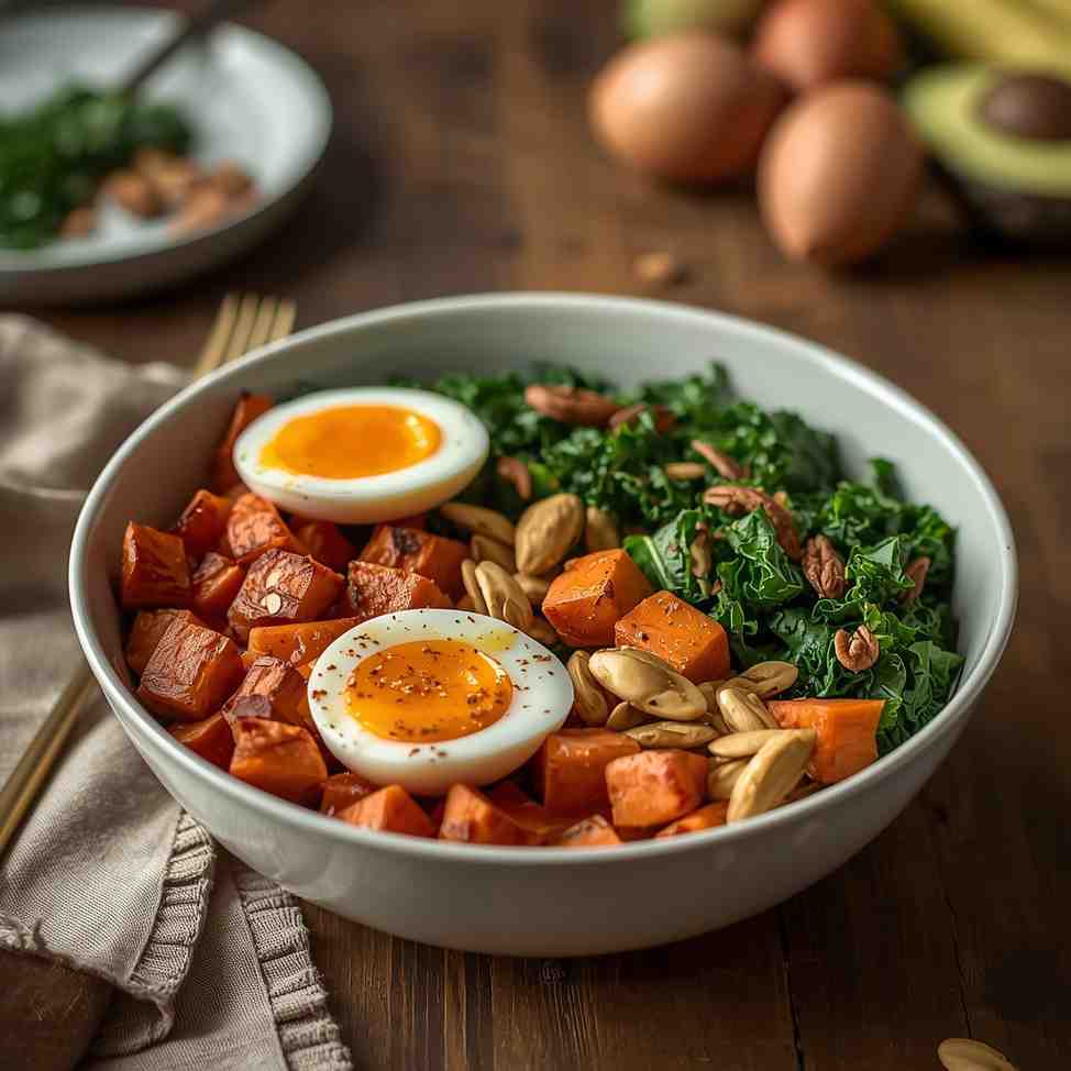 • Step 4: Assemble the Breakfast Bowl : Start with a layer of roasted sweet potatoes. Add sautéed kale on top. Place the eggs in the center. Add avocado slices and any extra toppings. Finish with a drizzle of olive oil or hot sauce if desired.