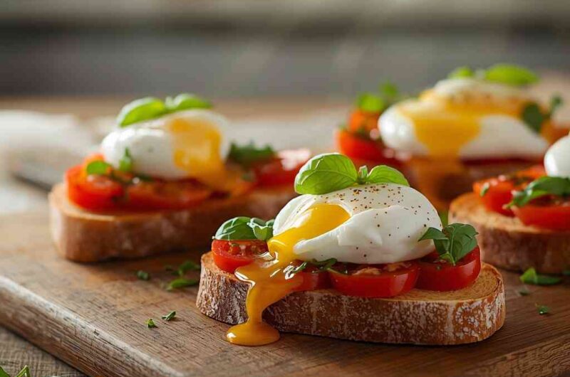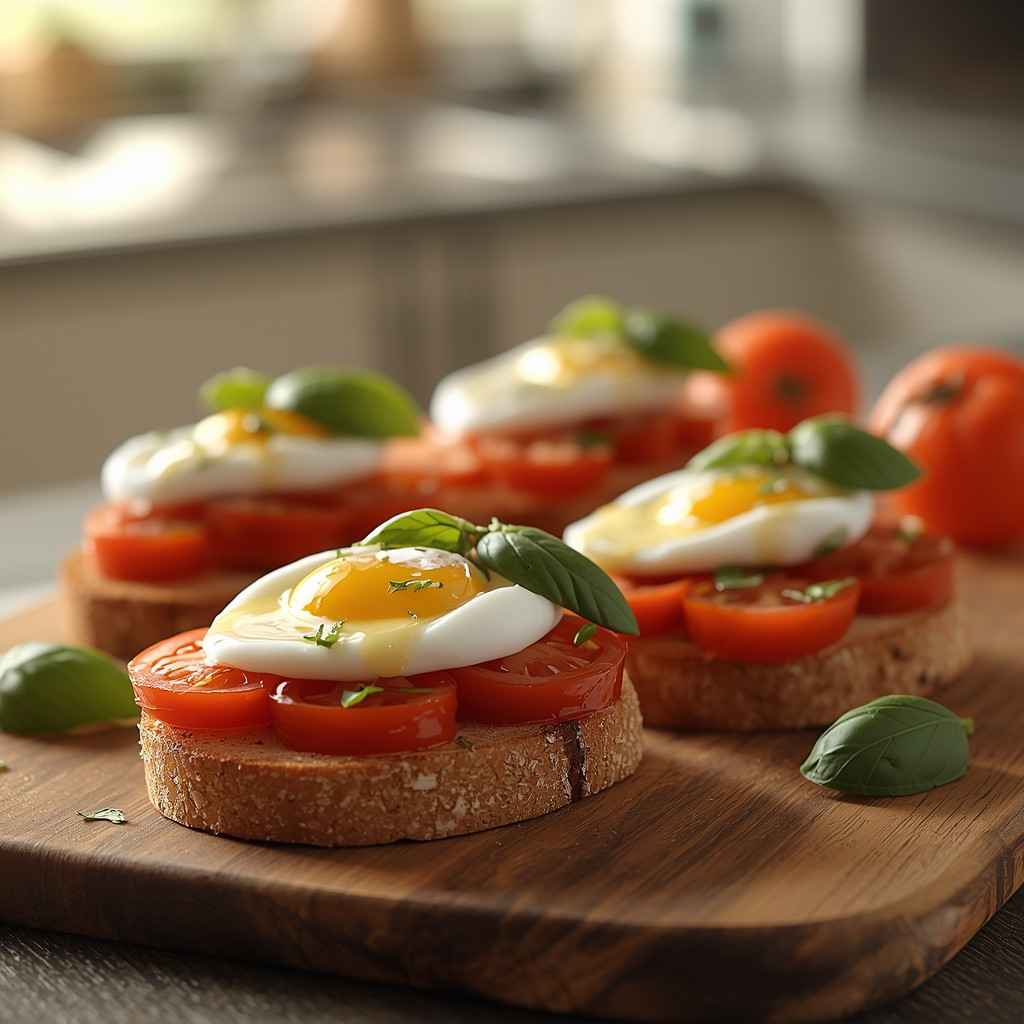 - Step 4: Assemble the Bruschetta : Spoon the tomato mixture generously over each toast slice. Place a cooked egg on top of the tomato layer.