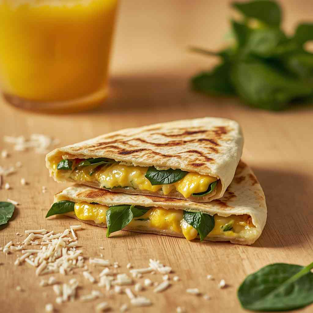 - Step 2: Assemble the Quesadilla : Place one tortilla on a clean surface or plate. Sprinkle a layer of cheese, then spread the scrambled eggs and spinach evenly on top. Add another layer of cheese for extra meltiness. Top with the second tortilla.