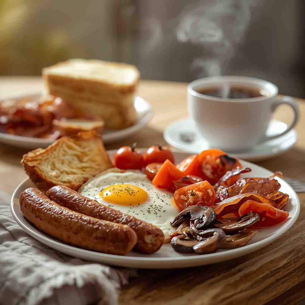 - Step 7: Assemble and Serve : On each plate, arrange sausages, bacon, eggs, baked beans, mushrooms, and tomatoes. Add buttered toast on the side. Serve immediately while everything is warm.