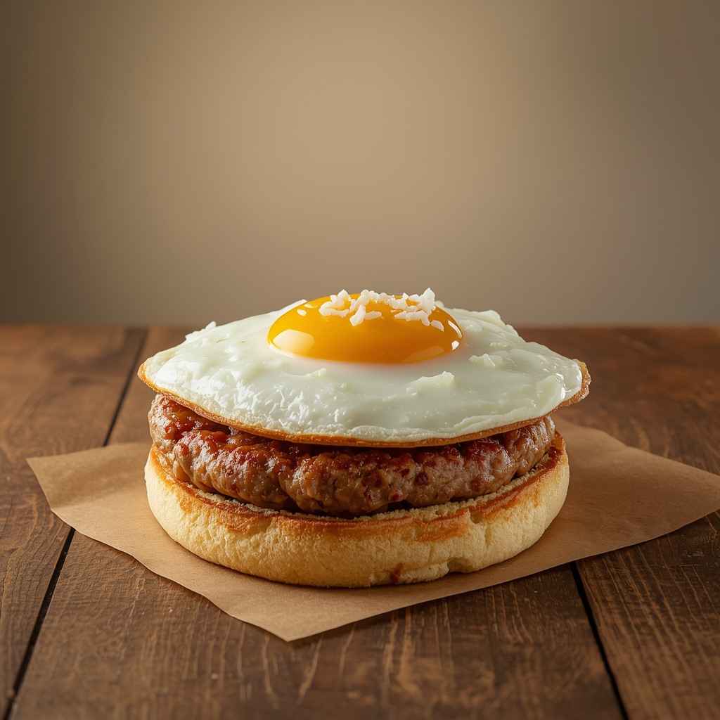 • Step 5: Assemble the Sandwich : Layer the bottom half of the English muffin with the sausage and cheese. Add the egg on top, followed by any optional veggies or sauce. Place the top half of the muffin over and press gently.