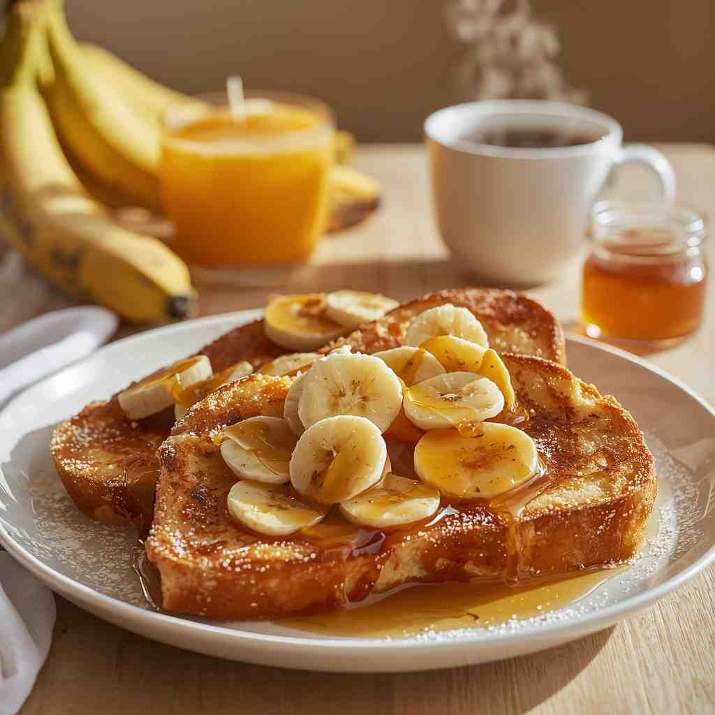 Serve your Honey Banana French Toast warm, topped with caramelized bananas, a drizzle of honey, and a sprinkle of cinnamon. Pair it with a hot cup of coffee, latte, or fresh orange juice for a balanced breakfast.
