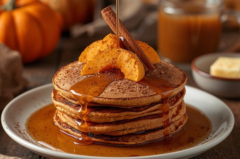 Serve the pancakes stacked high with cinnamon syrup cascading over the sides. For a festive touch, add a dollop of whipped cream and sprinkle with cinnamon or crushed pecans. Pair with coffee, chai, or hot apple cider for a truly cozy fall breakfast.