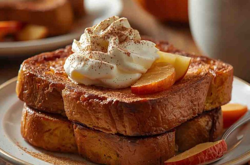Pumpkin Spice French Toast with Whipped Cream is the ultimate autumn breakfast indulgence — golden, custardy slices of bread infused with pumpkin purée, cinnamon, nutmeg, and a hint of vanilla. Each bite is soft inside, crisp outside, and bursting with cozy fall flavors. Topped with fluffy whipped cream and a drizzle of maple syrup, this French toast feels like eating pumpkin pie for breakfast — warm, nostalgic, and utterly irresistible.