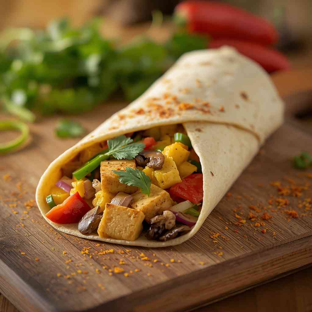 - Step 3: Assemble the Wrap : Warm tortillas in a dry pan or microwave for 10–15 seconds. Spread vegan mayonnaise or hummus over each tortilla (optional). Layer scrambled tofu and sautéed vegetables evenly on the tortilla. Sprinkle fresh herbs on top.