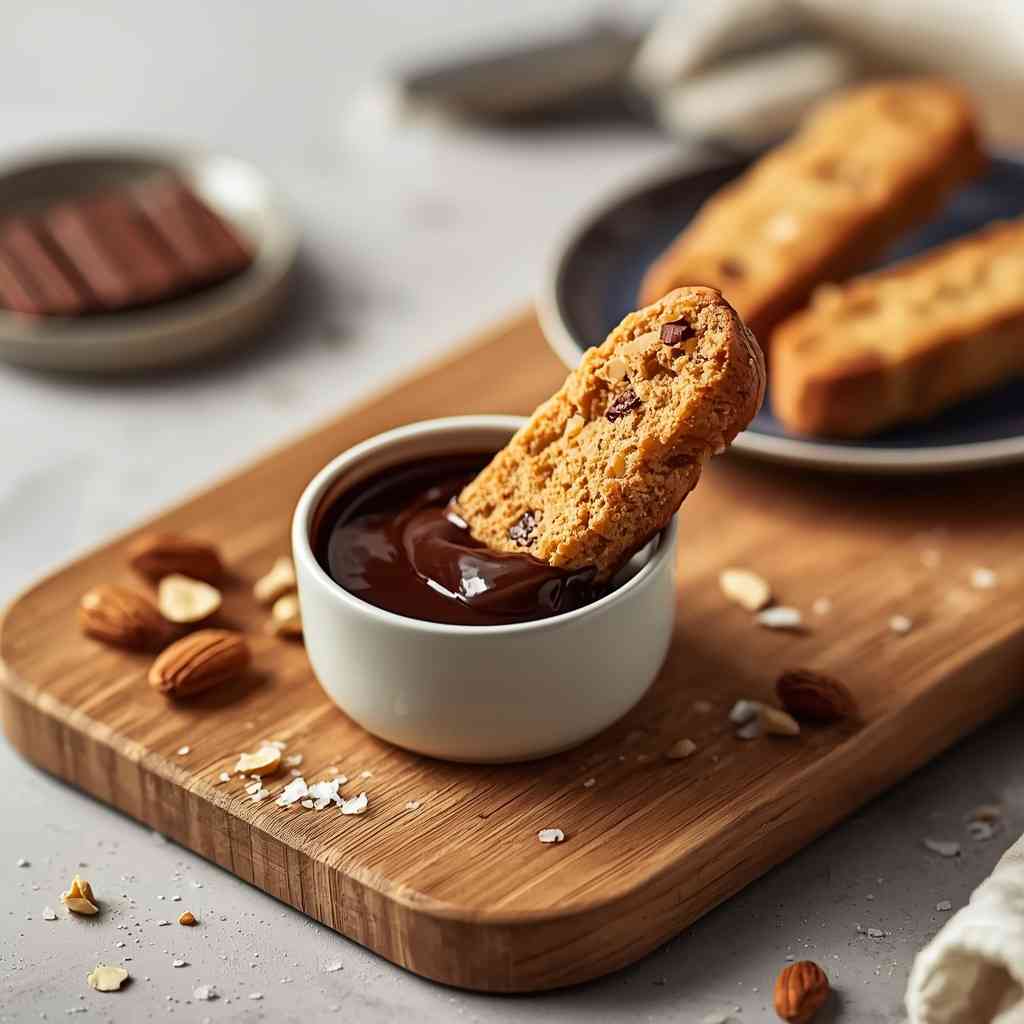 - Step 5: Dip in Dark Chocolate : Melt dark chocolate with coconut oil in a microwave or double boiler until smooth. Dip one end (or half) of each biscotti into the melted chocolate. Place dipped biscotti on parchment paper until the chocolate hardens completely (you can refrigerate them for faster setting).