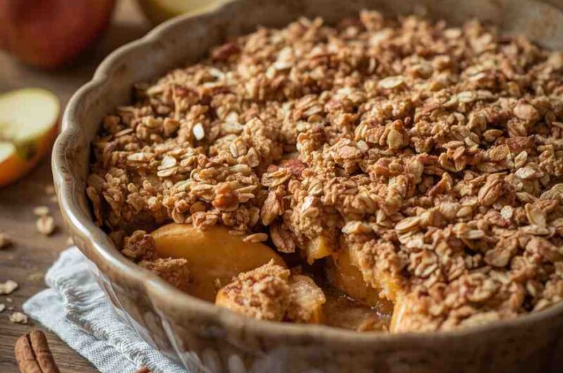 • Step 3: Assemble the Crumble : Evenly sprinkle the oat mixture over the apple filling, covering it completely. Do not press it down too firmly — you want the topping to stay crumbly and crisp.