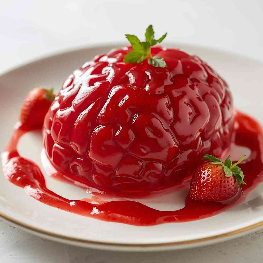 - Step 4: Unmold and Assemble : Dip the bottom of the mold briefly in warm water (5–10 seconds). Place a serving platter over the mold and invert carefully. Gently lift off the mold — revealing your wobbly, brain-like gelatin! Spoon the bloody strawberry sauce over the top and sides, letting it drip naturally for a gory effect.