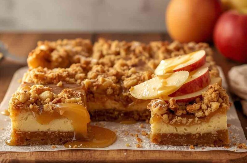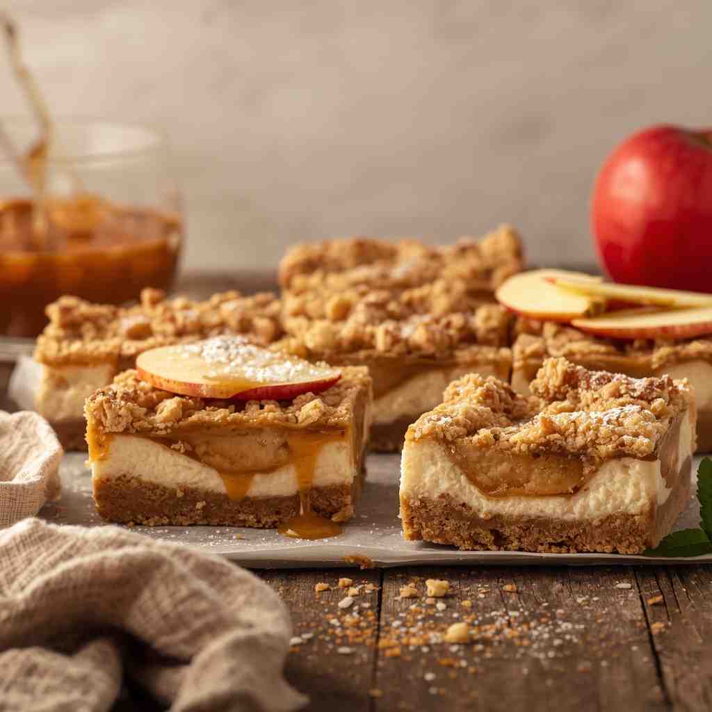 These Caramel Apple Cheesecake Bars are the perfect fusion of apple pie and classic cheesecake, layered over a buttery crust, topped with spiced apple slices, and finished with a golden crumble and silky caramel drizzle.