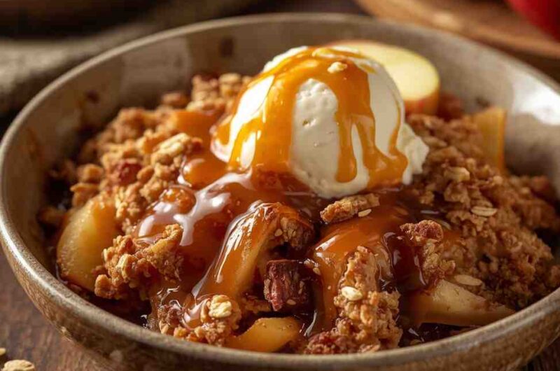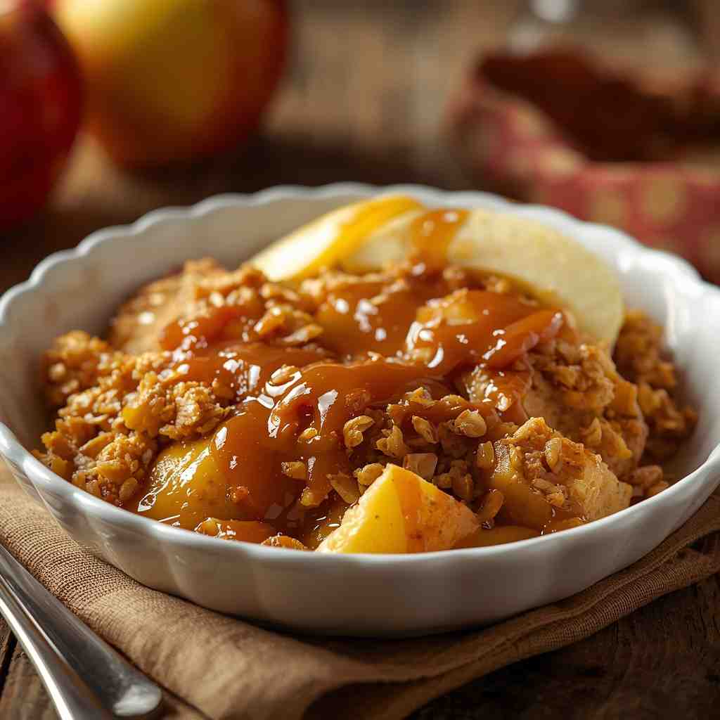 - Step 6: Serve : Let the crisp cool for 10–15 minutes before serving. Drizzle with extra caramel sauce and top with a scoop of vanilla ice cream for a decadent finish.