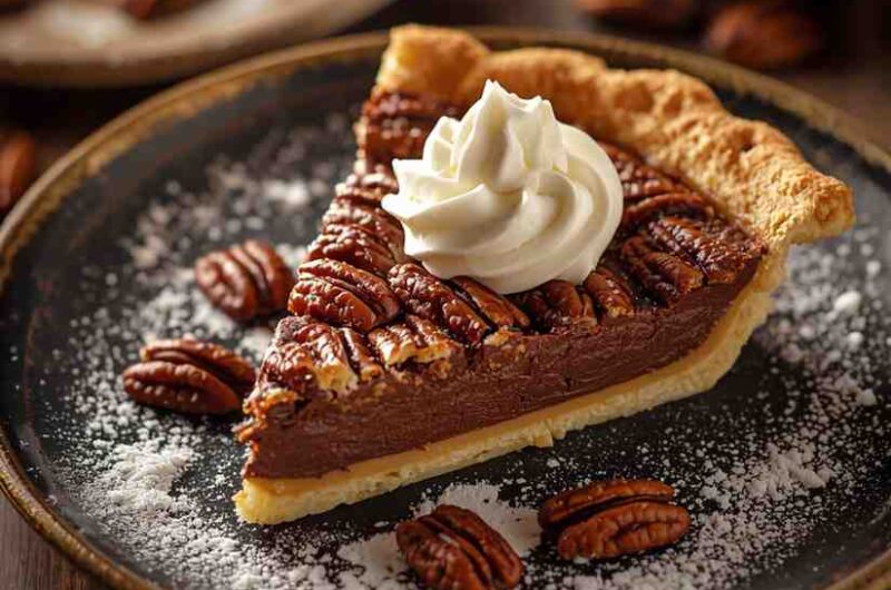 Chocolate Pecan Pie with Whipped Cream is a luxurious twist on the classic Southern dessert that brings together the nutty crunch of pecans, the silky richness of chocolate, and the buttery flakiness of pie crust, all topped with a soft cloud of freshly whipped cream.