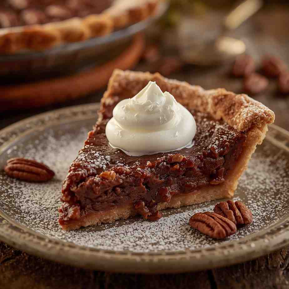 - Top each slice with a swirl of whipped cream and a sprinkle of chopped pecans or chocolate shavings.