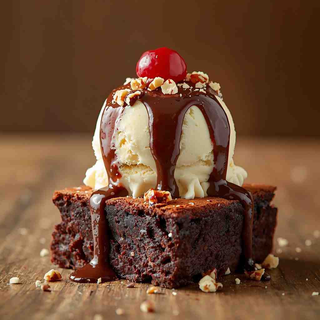 - Step 3: Assemble the Sundae : In serving bowls or dessert glasses, layer pieces of brownie at the bottom. Add one or two scoops of vanilla ice cream, drizzle warm fudge sauce generously, and repeat for more layers if desired. Top with whipped cream, a sprinkle of nuts, chocolate shavings, and a cherry on top.