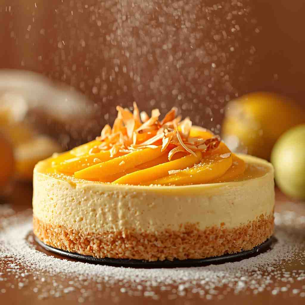 - Step 5: Garnish and Serve : Top the cheesecake with the mango glaze, fresh mango slices, and toasted coconut flakes. Slice and serve chilled.
