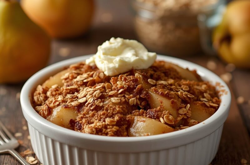 - Assemble and bake: Sprinkle the oat topping evenly over the pears. Bake for 35–40 minutes, or until the topping is golden brown and the pears are tender and bubbly.