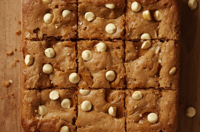 • Bake: Spread batter evenly into prepared pan. Sprinkle extra white chocolate chips on top. Bake for 30–35 minutes, or until edges are golden and center is set.