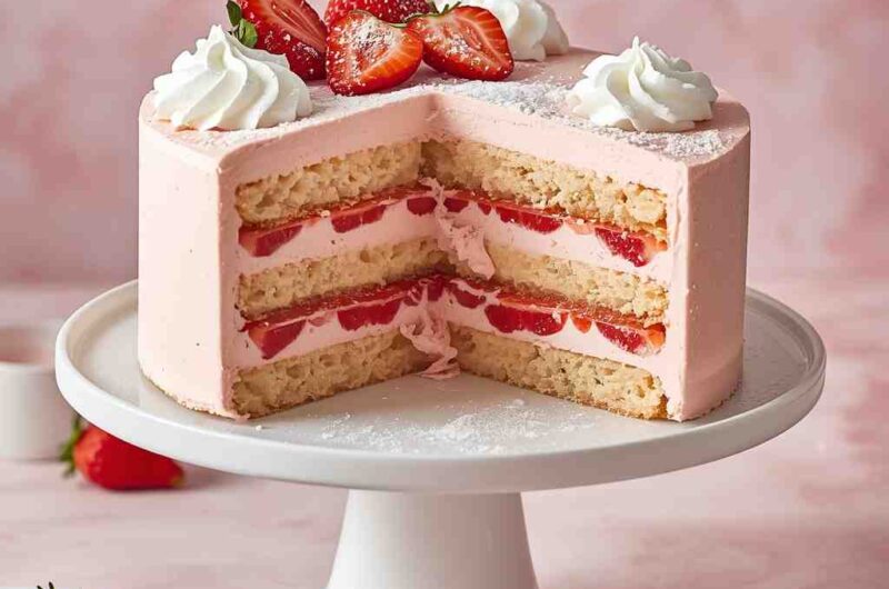 The combination of sweet strawberries, silky whipped cream, and a subtle sponge or biscuit base creates the perfect harmony. It’s not just delicious, it’s visually stunning too — a pink, cloud-like dessert that looks as good as it tastes.