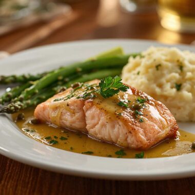 Bourbon Glazed Salmon is a luxurious, restaurant-quality dish that balances sweet, savory, and smoky flavors in one elegant meal. The richness of salmon pairs perfectly with a bourbon-based glaze that combines brown sugar, soy sauce, garlic, and a hint of Dijon mustard. As the salmon bakes or grills, the glaze caramelizes, creating a slightly sticky, flavorful coating that’s irresistible.