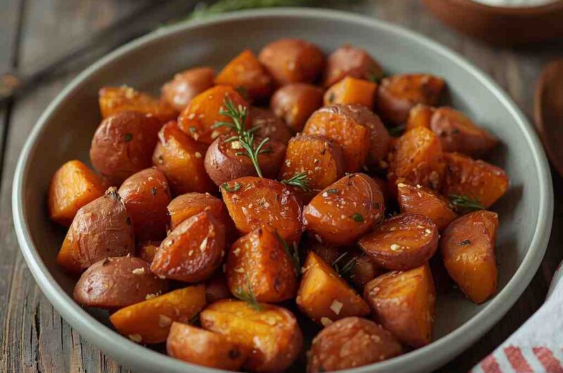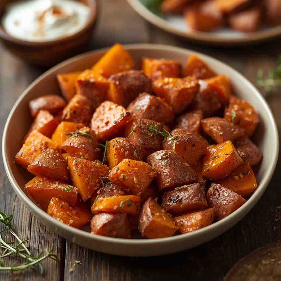 6. Roast: Bake for 35–40 minutes, stirring halfway through, until the sweet potatoes are tender inside and caramelized on the edges.