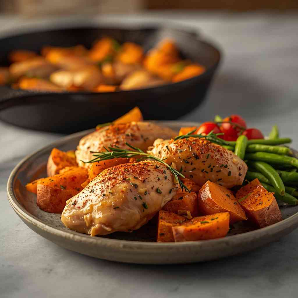 - Check doneness: chicken should reach 165°F (74°C) and sweet potatoes should be fork-tender.