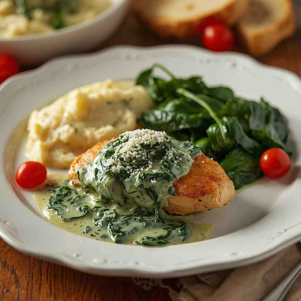 Place the chicken back into the skillet and coat with the creamy spinach sauce. Simmer 2–3 minutes to marry flavors.