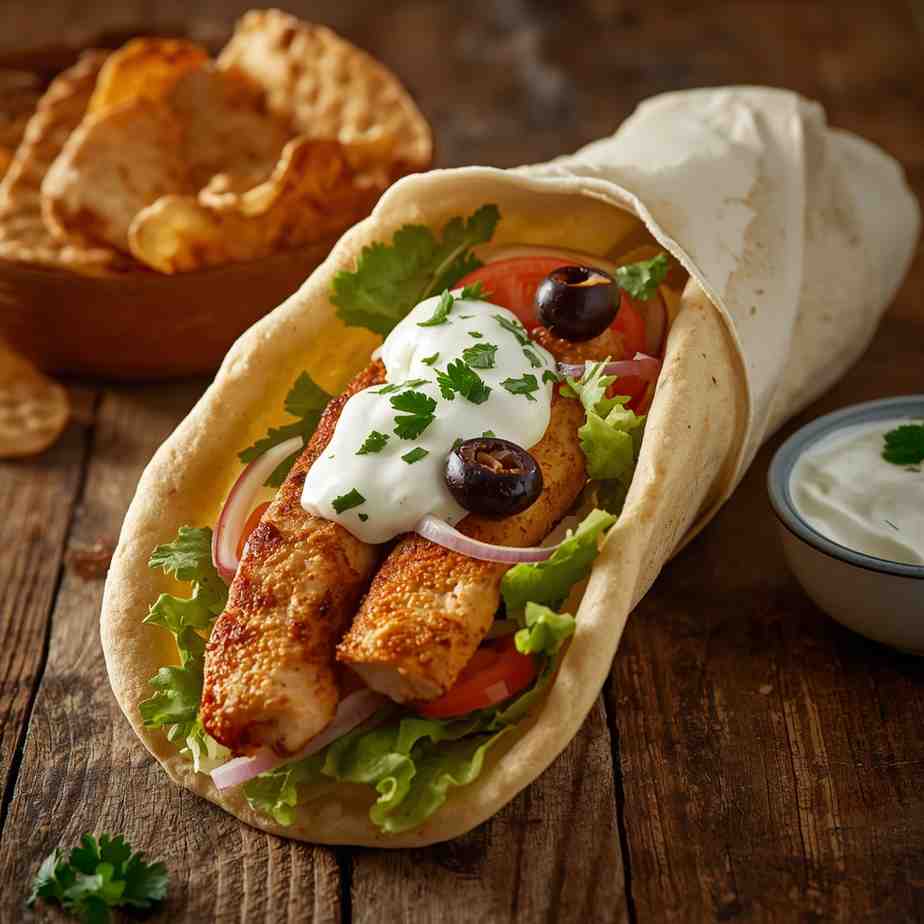 • Assemble the Gyros : Warm pita bread. Spread garlic yogurt sauce over the bread. Add sliced chicken, tomatoes, cucumber, onion, and desired toppings. Fold or wrap and serve warm.