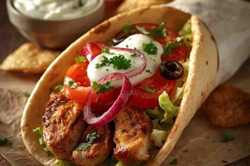 Chicken Gyros with Garlic Yogurt Sauce is a vibrant Mediterranean dish inspired by the traditional Greek street-food classic. Tender marinated chicken is grilled until beautifully golden, then wrapped in warm pita bread and topped with fresh vegetables and a creamy garlic yogurt sauce. The balance of refreshing flavors, soft bread, and savory protein makes this dish both satisfying and exciting.