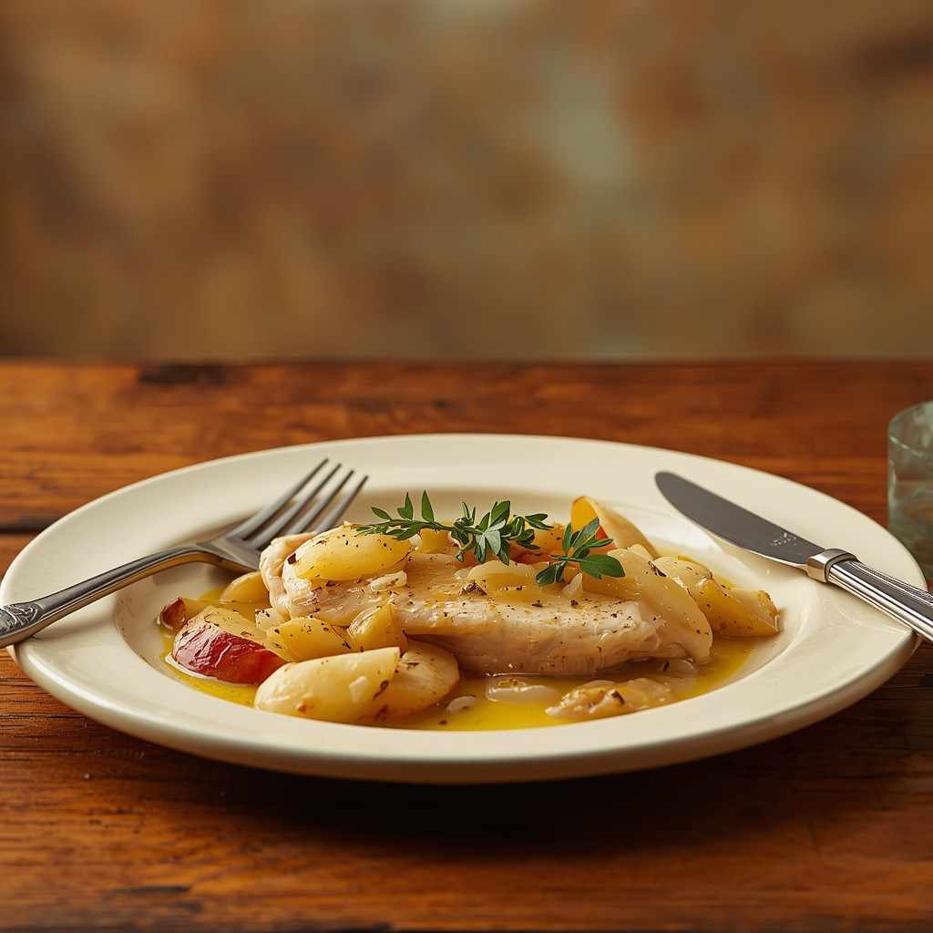 Succulent pan-seared chicken is simmered gently with sautéed apples, onions, herbs, and a splash of Calvados or dry cider. Finally, everything is enriched with heavy cream to create a silky, velvety sauce that perfectly balances sweetness, savory depth, and subtle acidity.