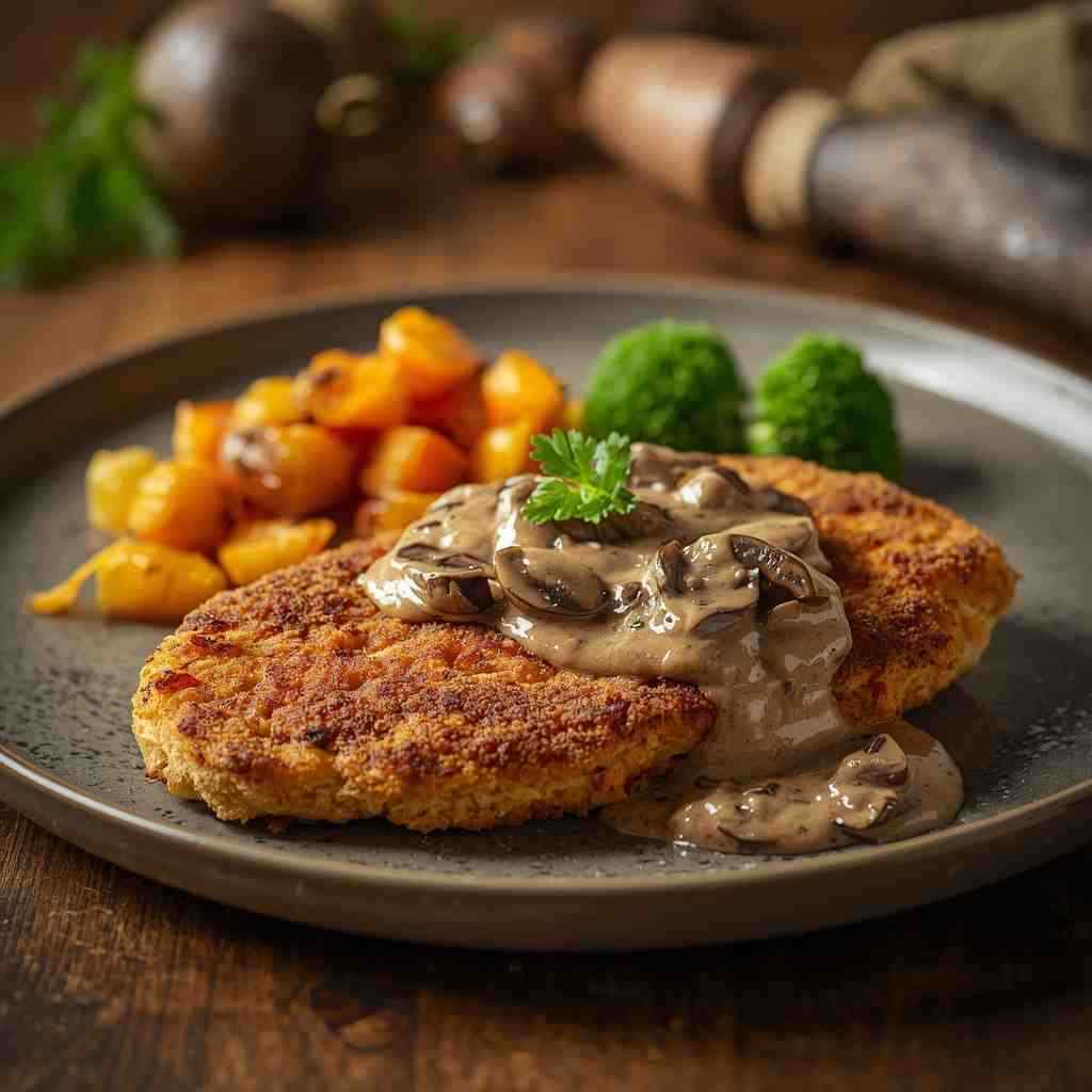 Perfect for family dinners or special occasions, this dish balances textures and flavors beautifully. The crunch of the schnitzel paired with the earthy, velvety mushroom sauce creates a culinary experience that’s both satisfying and indulgent.