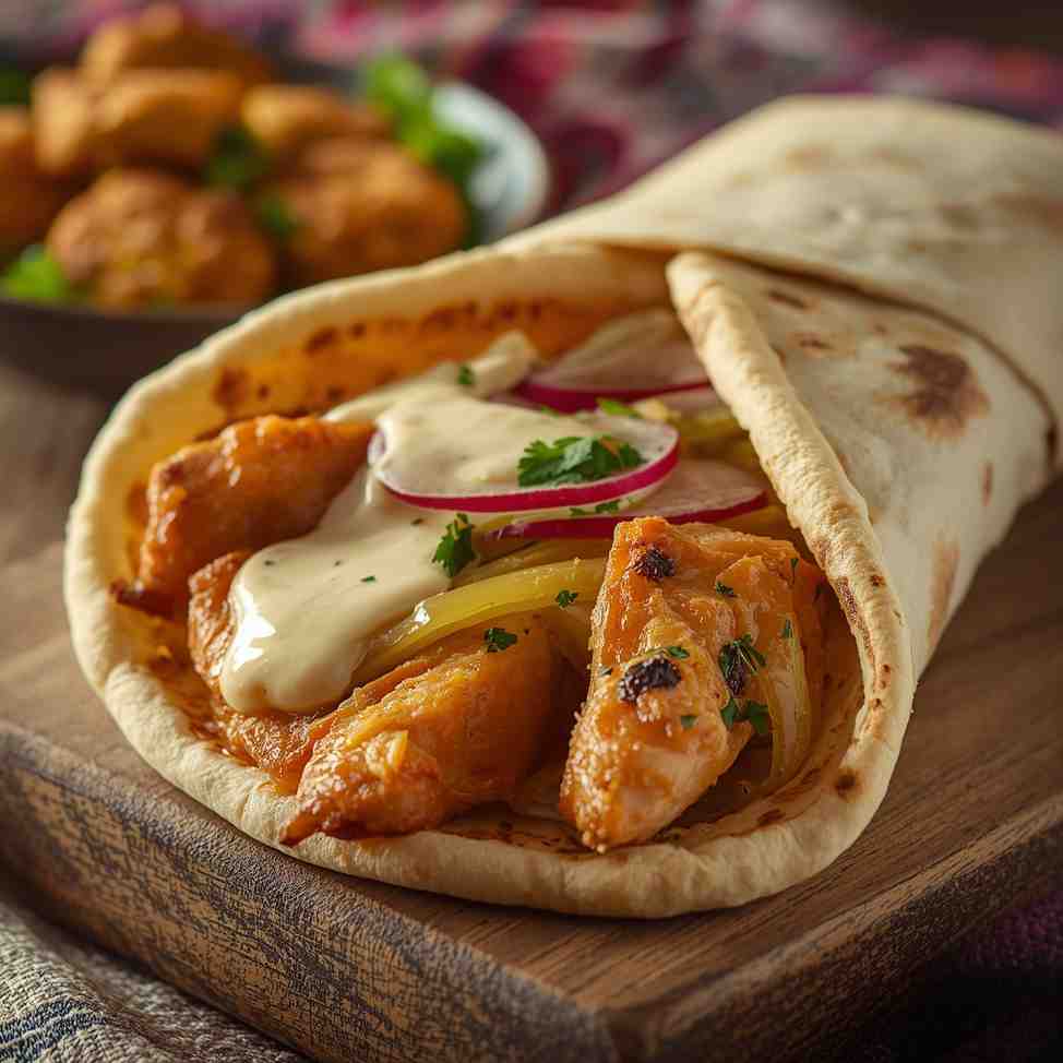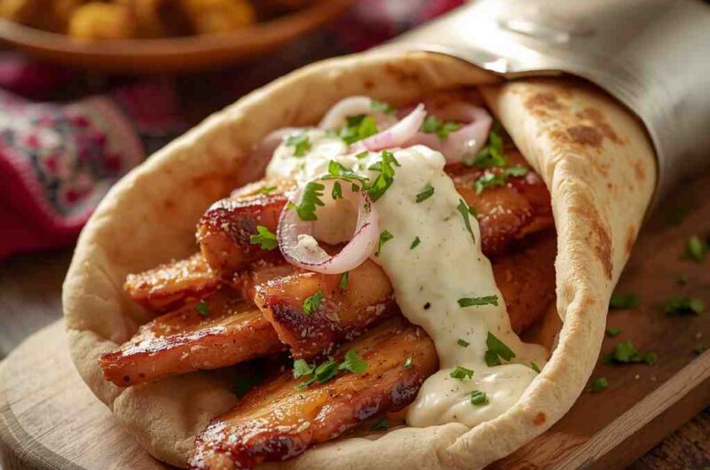 This dish combines warm, spiced chicken wrapped in soft pita bread and paired with fresh toppings like tomatoes, onions, pickles, lettuce, and an ultra-creamy garlic sauce that brings everything together. Every bite is comforting yet exciting, making it perfect for family dinners, gatherings, or meal prep.