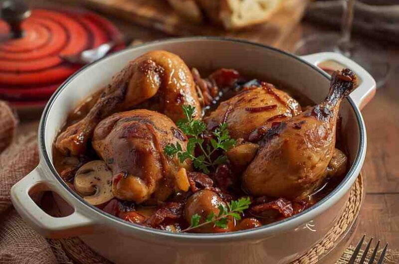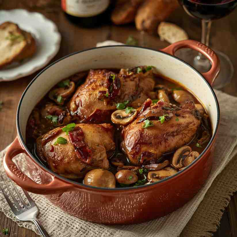 Classic Coq au Vin is one of the most iconic dishes in French cuisine—a rich, hearty braised chicken stew infused with red wine, aromatic herbs, silky sauce, mushrooms, onions, and smoky bacon. Originating from rustic French cooking, this dish transforms simple ingredients into something remarkable through slow simmering and deep flavor layering.