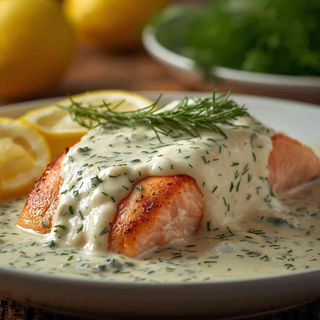 • Step 5: Serve and Enjoy : Plate each salmon fillet and drizzle with creamy dill sauce. Garnish with extra dill or lemon slices if desired.