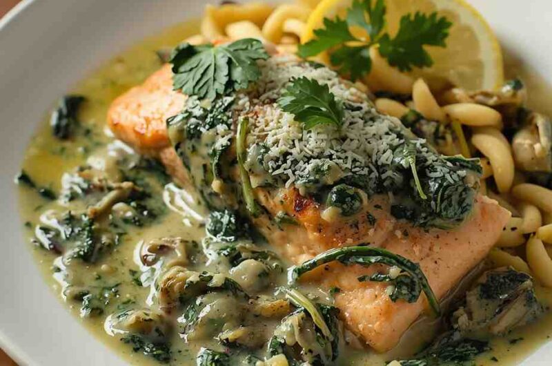 Creamy Spinach Artichoke Salmon is a decadent yet healthy dish that pairs tender, flaky salmon with a luscious, garlicky spinach and artichoke cream sauce. Inspired by the classic appetizer, this recipe transforms the creamy, cheesy, and savory flavors into a full meal with heart-healthy omega-3-rich salmon. The combination of spinach, artichokes, cream, and Parmesan cheese creates a luxurious sauce that perfectly coats the salmon, making every bite irresistible.