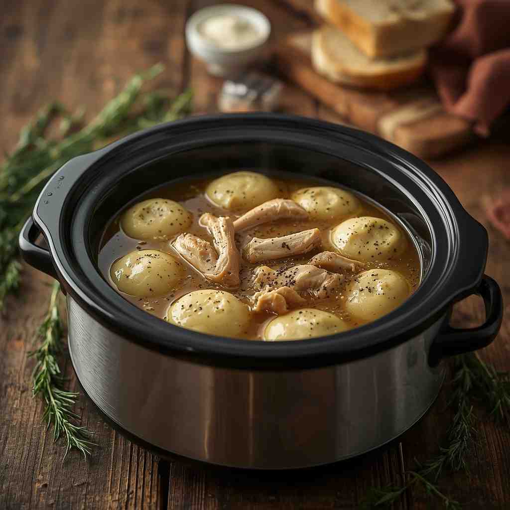 - Step 4: Add Dumplings to the Crockpot : Drop spoonfuls of the dumpling dough directly into the crockpot on top of the chicken and vegetables. Cover and cook on high for 30–40 minutes until dumplings are cooked through and fluffy.