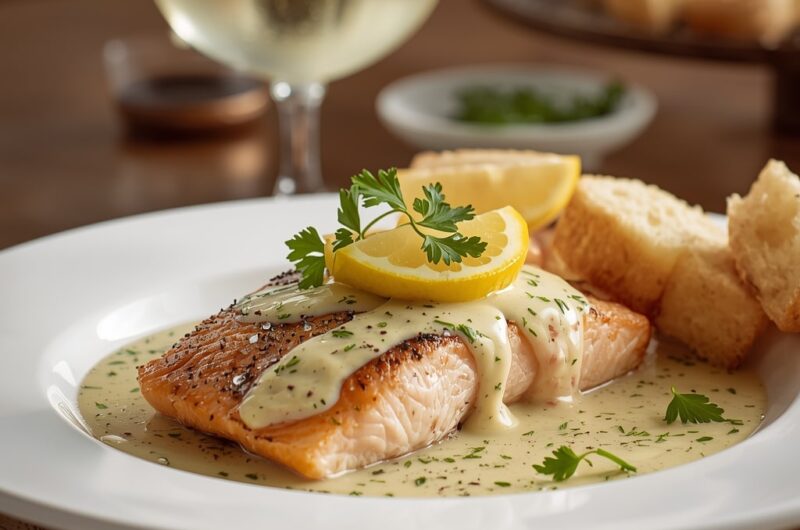 • Prepare the Salmon Pat salmon fillets dry with paper towels. Season both sides generously with salt and pepper. Heat olive oil and 2 tbsp butter in a large skillet over medium-high heat. Place salmon fillets (skin-side down if skin is on) and sear for 3–4 minutes per side until golden brown and cooked through. Remove salmon from skillet and set aside on a plate.
