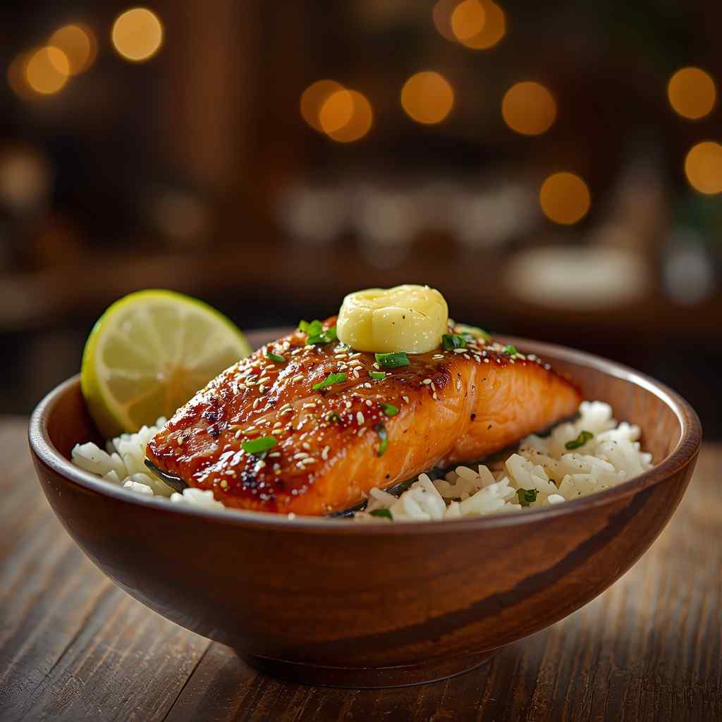 - Step 4: Assemble the Rice Bowls : Divide warm rice between 4 bowls. Place a salmon fillet on each. Drizzle with extra garlic butter from the pan. Add your favorite toppings — avocado, broccoli, cucumber, or pickled onions. Finish with a squeeze of lemon or a light soy drizzle.