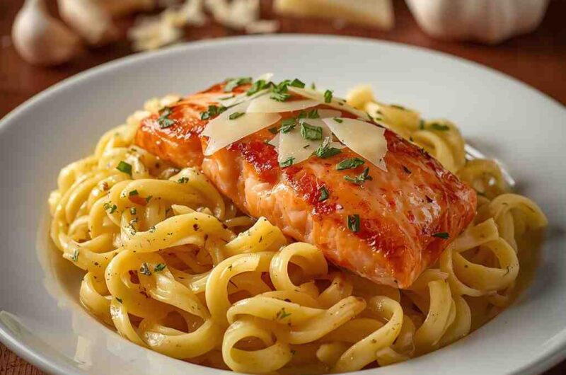 It’s a dish that feels indulgent but is surprisingly easy to make. I especially love how the garlic and parmesan blend to create a comforting flavor base that complements the salmon so perfectly. Plus, it looks absolutely stunning on the plate — creamy pasta tangled with pink flakes of salmon!
