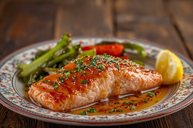 It’s a dish that feels gourmet but takes less than 30 minutes, making it just as suitable for a weeknight family dinner as it is for entertaining guests. The tender, flaky salmon absorbs the glaze beautifully, ensuring every bite is packed with flavor.