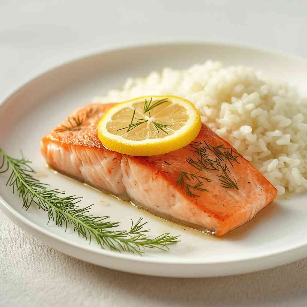 - Step 5: Plate and Serve : Place a portion of rice on each plate. Top with a salmon fillet. Drizzle with any pan juices and garnish with lemon slices and extra dill.